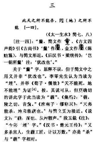 郭店太一生水简7-8有句:此天之所不能杀,地之所不能釐,阴阳之所不能成。注释把“地之所不能X”,X释作釐。引《後汉书·梁统传》“岂一朝所釐”,注:“犹改也”。今天讀到《淮南子·缪称训》有句类似的话:“懷情抱質,天弗能殺,地弗能薶也。”薶從貍聲,貍從里聲簡文字從里,應該可以讀作“薶”。