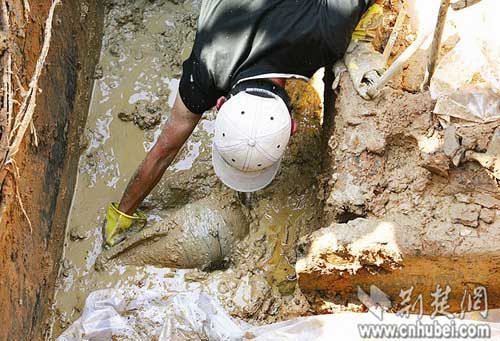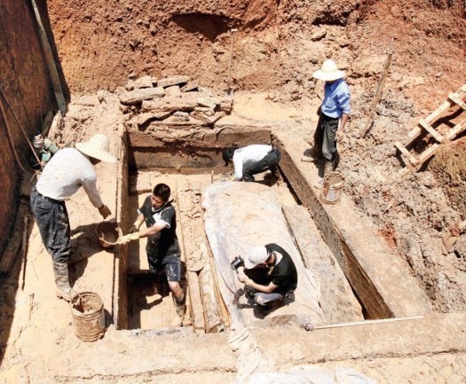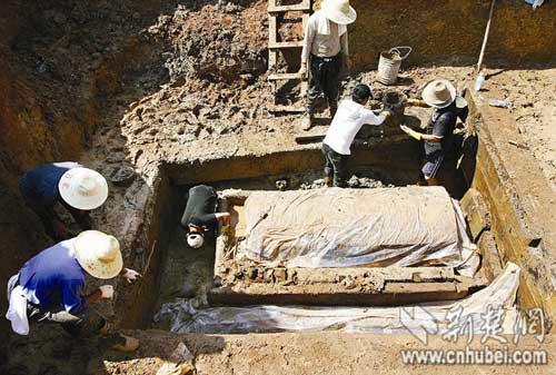 昨日,考古工作人员小心翼翼地清理墓室内的淤泥。开棺后,发现成批有字简,墓室的核心内棺将于近日打开。 本报记者 田振龙 摄 出土陶器漆器及竹简,内棺将于近日打开,专家估计墓主尸骨很难保存完整 长江商报消息(记者 吴边)经过精心准备,昨日位于江夏区山坡乡光星村丁家嘴湾武咸城际铁路工地的战国楚墓终于开棺,埋藏地下2000多年的楚国贵族墓室重见天日。据了解,从墓室的规模和特征可以断定该墓室为战国时期楚国贵族墓。目前,从墓室中已发现陶器、漆器、竹简和木质镇墓兽,其中竹简已送专家解读。据了解,墓室的核心部分——内棺将于近日打开。 专家介绍,此次发现的古墓是武汉市发掘的墓室面积最大的战国楚墓。 现场:外棺打开墓室分3层 昨日上午,记者来到位于江夏区山坡乡光星村丁家嘴湾武咸城际铁路工地的古墓现场时,发掘工作已经开始,大批考古工作者在开放的墓室内清理淤泥。记者在现场看到,两个墓室并排在一起均被挖开,之间有约5米的距离。两墓室平面呈“凸”字形,墓道均朝东,南边的墓室较大。此时工作人员正在清理南边的2号墓,而北边的一号墓的墓室里面都是积水。 在墓室附近的平地上堆积着几根黑色的木头,据了解,这些木头为棺椁盖板,表面已经炭化,无人知道其种类。记者站在2号墓室旁的高地上看见墓室里面被分为3层,其中最里层的内棺还没有被打开,上面被一层塑料布覆盖住。据现场考古队工作人员说,昨日上午6时许,他们打开墓室内的外棺,随后将外棺和内棺之间的淤泥清空。 发现:墓坑里有一盗墓洞 据在现场的武汉市考古研究所党支部书记、考古专家李永康介绍,他们正在挖掘的编号为M2的楚墓墓坑长7.2米宽5.5米,而编号为M1的墓坑长6.4米宽4米,但有一个盗墓洞。“2号墓的结构为上层是填土,接着为青膏泥、竹简、竹席,竹席下面是隔板然后才是内棺和分箱。从外观上看,这个墓室里面被分为了3个小室。”据了解,M2号墓坑内的是3重棺墓,有外中内三个棺木,其中外棺和中棺已经打开,只剩下内棺将于近日开启。“我们上午把回填土和青膏泥已清理干净,在坑底露出一个轮廓明显的木棺,还浸泡在泥水中,这个内棺长2.28米宽0.78米,近日将会打开。”不过由于是木质结构,根据墓穴内积水严重的情况来看,墓主尸骨完整保存下来的可能性较小。 出土:篆体竹简已送解读 据李永康说,发掘时在内棺上发现9片竹简。“这些竹简长30厘米,宽0.8厘米,单面有字,发现时对折放置。上面有红色,篆体手写字迹,目前已经给武汉大学竹帛研究中心主任陈伟教授及荆州市文物保护中心主任吴顺清解读,这些竹简比九连墩里面的无字竹简更有考古价值。”随后记者联系上陈伟教授,据他说,竹简还在紧张研读中,相关情况暂不便透露。 据了解,墓室内还发现一把带钮的鼓腹陶壶,一个疑似有彩绘的木质漆盘,一座已破碎的仿铜质陶鼎,同时在西南角发现了一个木质镇墓兽,因腐朽只剩底座,尚无法辨明是何兽。 ◇花絮 修铁路时意外发现墓室 据附近的施工方中铁十八局的工作人员介绍,今年早些时候他们便来到此处修建武汉到咸宁的城际铁路。“之前我们把这里填高,修建了一条临时道路,但是车辆经过此处时都会使路基下陷。”施工方发现情况后对此处填沙,但是下陷问题仍旧没有解决。4月28日工地挖掘机突然挖出一块柱形木头,后又接连挖出四块,还看到一个宽两米多的洞口,洞口向外涌水,深度无法预测。工地人员判断可能是一处古墓,于是向有关文物部门汇报,并停止挖掘,并安排专人日夜守候。 新闻链接: 江夏战国楚墓初揭面纱 9片罕见有字楚简出土