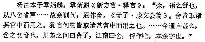 《孟子·滕文公上》:“且許子何不爲陶冶,舍皆取諸其宮中而用之?何爲紛紛然與百工交易?何許子之不憚煩?”此章乃古文名篇,拜各類《古代漢語》教材選入之賜,傳誦極廣。其中“舍”字乃一大公案。當年章炳麟說“舍”即吾鄉方言“啥子”之“啥”,曾遭王力先生痛批。