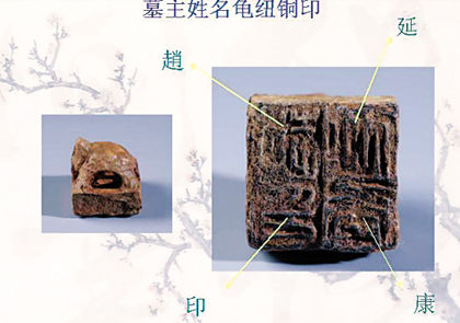 这是一枚“龟纽铜印”,印面文字是“赵延康印”4个字,当是墓主人姓名。正是这“赵”字,让专家们惊喜不已,因为南越国王室宗亲都姓“赵”,这说明墓主是南越国的遗老;“现已发现的南越二代王赵昩的‘文帝行玺’,是游龙鎏金印;其‘左夫人印’是龟钮的鎏金铜印;由此可见,龟纽铜印的级别是相当高的,墓主应归入南越国帝王将相之列。”市考古所专家马建国保守估计,“墓主人身份还不能最后明确断定,但如果一定要给他的级别列个范围的话,他至少是位将军,南越国的将军。”