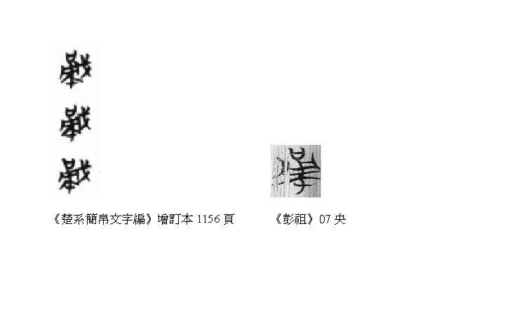 同,反接近彭祖的央字。《楚文字編》789頁所列的天星簡[甬戈]字,則未見下面加八形的寫