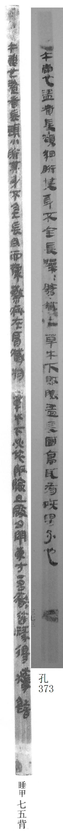 午,鹿也。盜者長頸,小胻,其身不全,長耳而操蔡,疵在肩,臧(藏)於草木下,必依阪險,旦啟夕閉東方。•名徹達祿得獲錯。(簡七五背)[1]