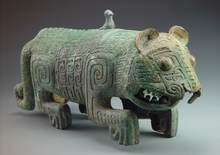 在这座墓葬出土的青铜礼器和其它一些器物上有一个惹眼的、十分明显的特征,那就是虎的形象。在青铜鼎的两个鼎耳上各站立着一只形象生动的虎。虎的形象,无疑是和这个方国的图腾有关,也可能是这个方国首领的标志。