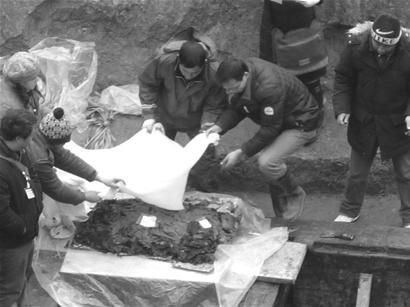 图为:鉴于竹简的珍贵性和易损性,考古专家采用整体分块铲托法发掘