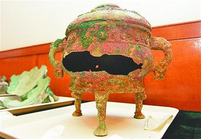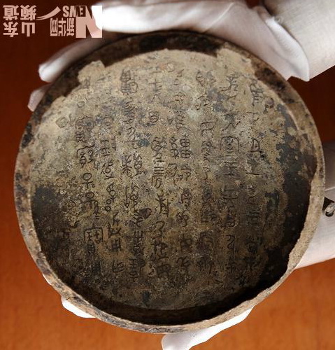 图二:考古现场出土的一件青铜器,内带有铭文。