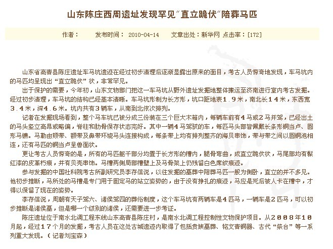 新华网济南4月12日专电(记者刘宝森)山东省高青县陈庄遗址车马坑遗迹在经过初步清理后逐渐显露出原来的面目,考古人员惊奇地发现,车马坑内的马匹均呈现出“直立跪伏”状,非常罕见。