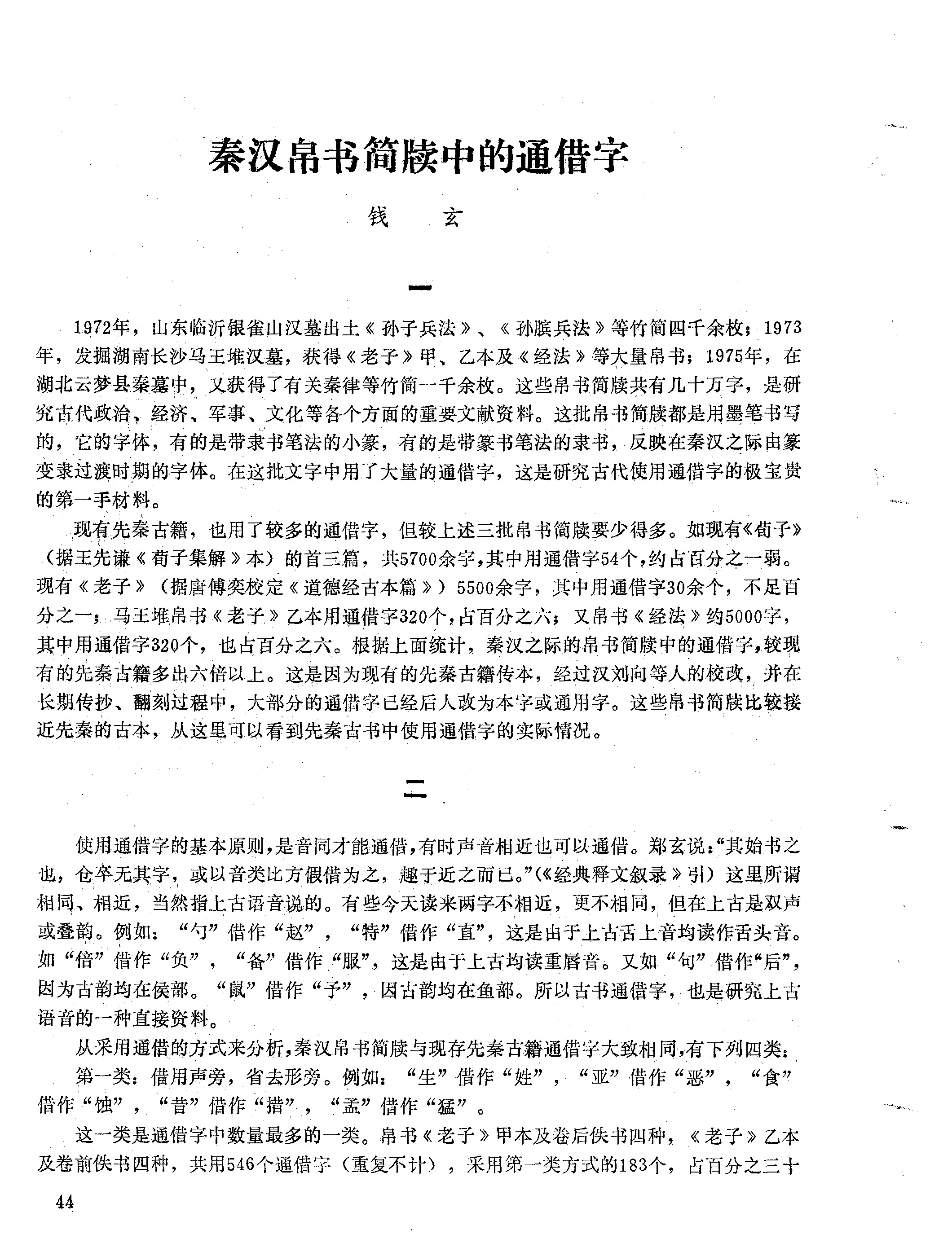 錢玄〈秦漢帛書簡牘中的通假字》,《 南京師院學報》1980年第3期。
