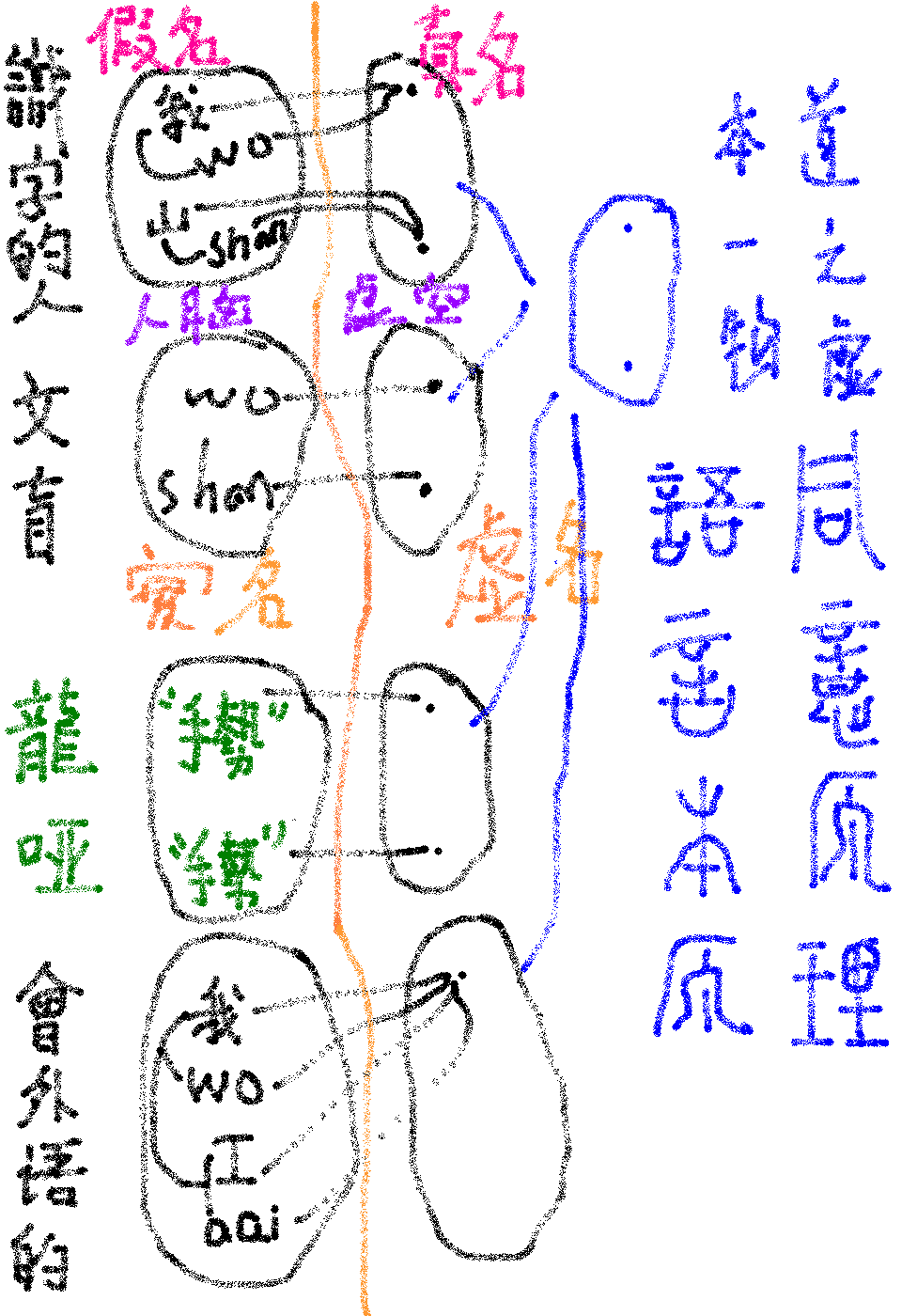 道可道,非常道,名可名,非常名。此名非彼名。字非名。聲亦非名。字是名的圖形映射。聲是名的語音映射。名,從夕從口。名不可見,故以口言之。---------------------------假名非真名。真名不可見,存在於道中。真名是虛名。假名可見,存在於人腦中,存在於世界中。假名是實名。