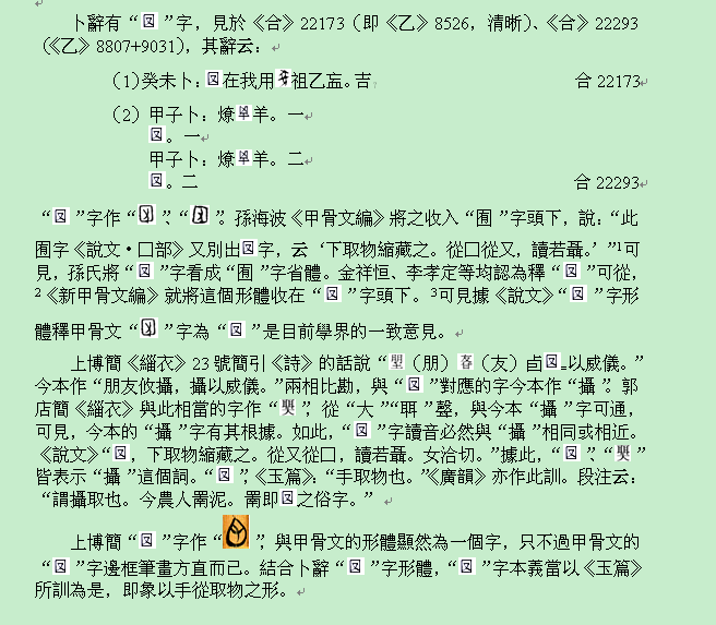 不知道將甲骨文的釋作《說文》「下取物缩藏之」的[囗又]有沒有什麼硬證?