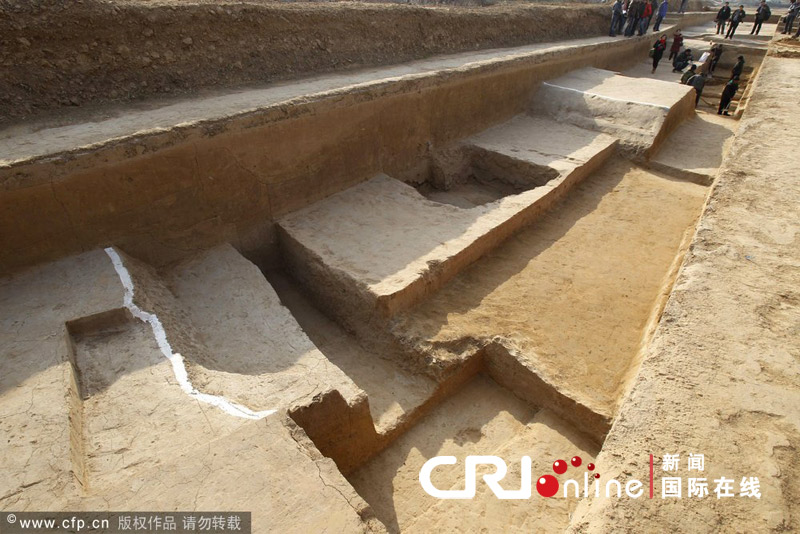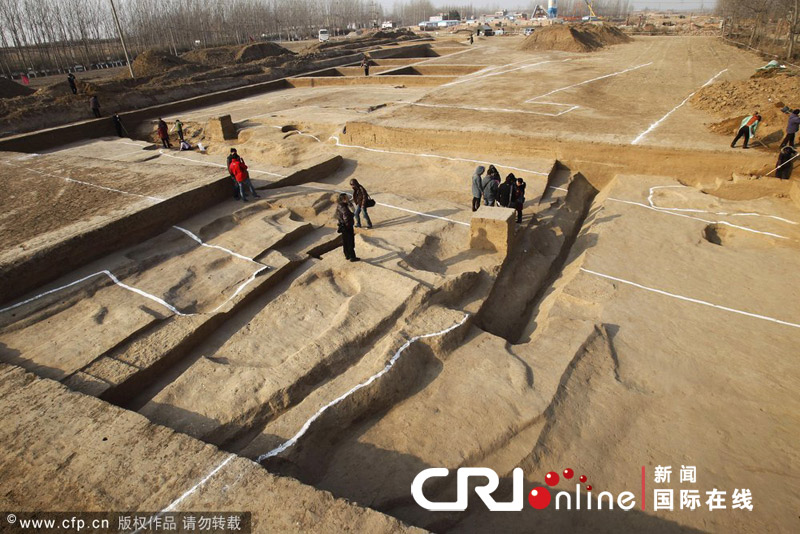 在商代城址东墙偏南的部位,记者看到了正在发掘中的城门遗址,考古工作人员已经用白灰大致勾勒出了城门的格局。门有两重,道路为东西走向,宽4米~6米。