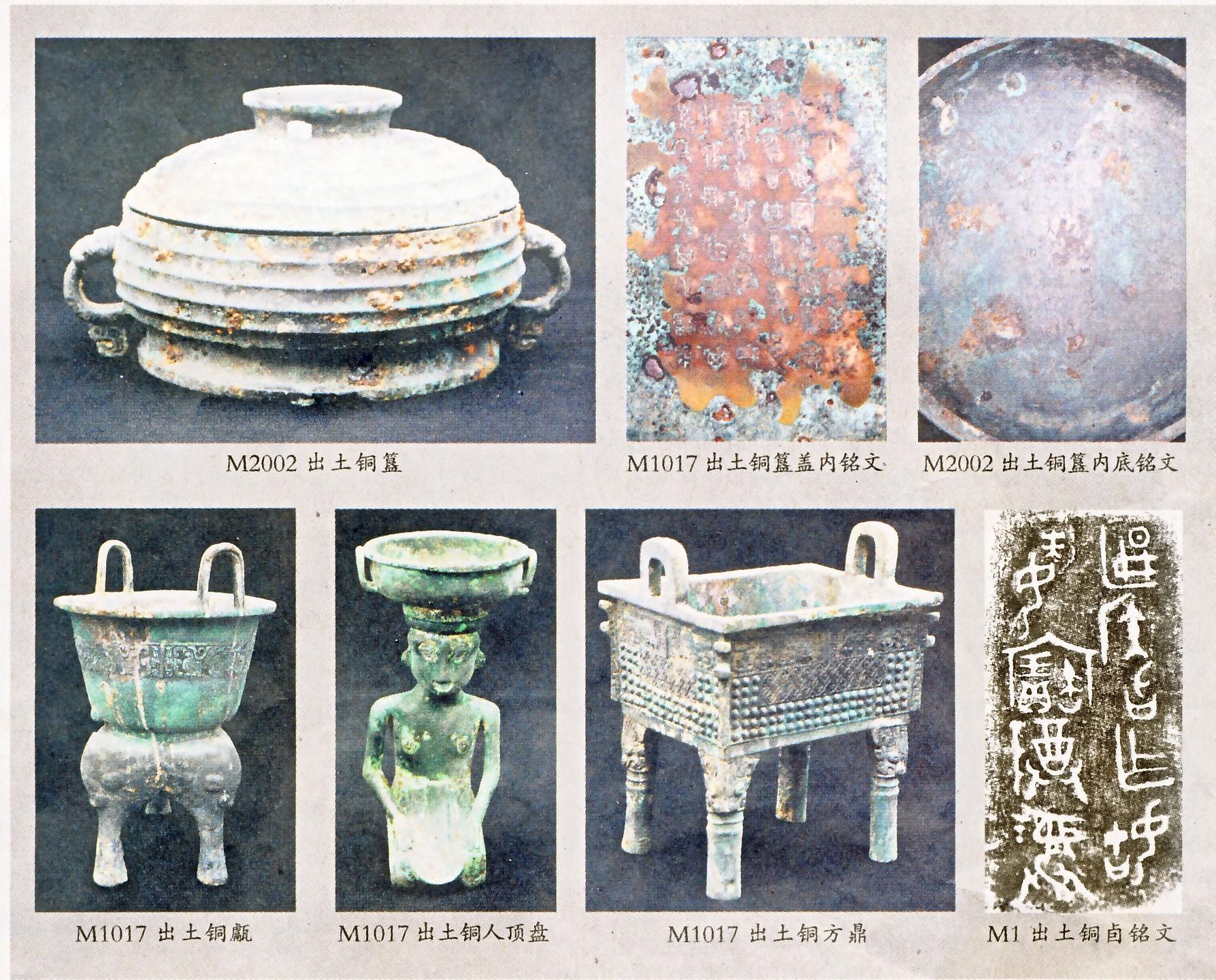 M1为东西方向,土坑竖穴,口小底大,墓口长4.25米、宽3.22米、墓底长4.6米、宽3.78米、自深9.75米,在墓口平面四角外发现4个通向墓壁的斜洞,这是继绛县横水墓地之后又一次发现类似的斜洞设施。墓主头向西,仰身直下肢,一棺一椁,椁底有一腰坑。在墓室二层台之上四壁发现11个壁龛,壁龛内放置漆木器、原始瓷器和陶器等物,已发现的漆木器有俎、罍、豆、壶、杯(双耳杯、单耳杯、角状杯)、牺尊、坐屏等等,在一座墓葬内发现如此多的壁龛、并且在壁龛内放置大量器物的现象,为西周墓考古中首见。在东部二层台上发现两个漆木俑,双足站立于漆木龟上,双手作持物状,两俑前面及侧面放置有漆木器,这在中原地区西周墓葬内也是首见。在其他几面二层台上还发现有带木柄铜兵器和漆木盾牌等。在墓室内棺椁之间或棺盖上发现了大量的青铜器、原始瓷器、陶器等物,其中青铜器数量最多,包括礼器、乐器、兵器、工具、车马器等,青铜礼器中有鼎24件、簋9件、鬲7件、甗1件、盘1件、盉1件、觚1件、爵6件、觶8件、尊2件、卣4件、罍1件、单耳罐1件、斗1件等,乐器有铜钟和铙3组8件,发现的木盾牌青铜饰昜、兵器戈、戟、矛、钺等30余件都具有非常高的价值,很多兵器遗存有木柄,铜工具有斧、凿、铲等。铜车马器有铜挂缰钩、銮铃、车辖、当卢等,还发现原始瓷尊4件,瓷豆6件,瓷瓿1件,陶器有鼎2件、鬲1件、豆6件、筒形尊1件、爵杯2件、 |