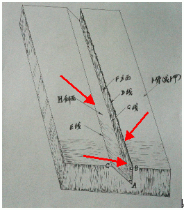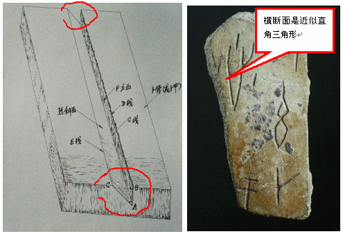 为便于阐述,我暂且对刀刻甲骨文字凹槽呈现出的一个角、两个面、三条线和横断面“近似直角三角形”给以命名,如示意图:
