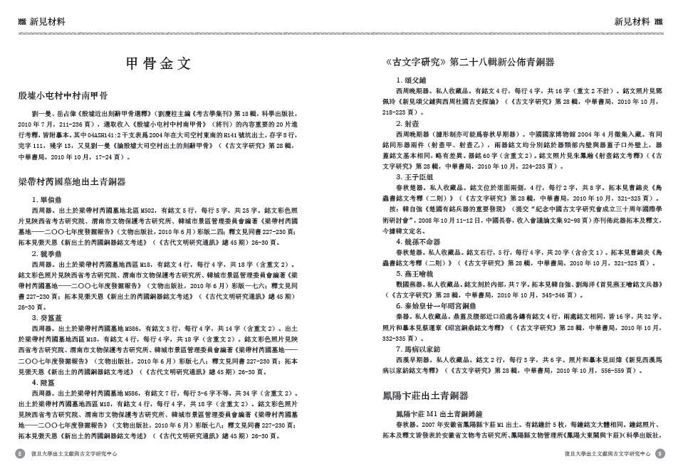 1.新見材料:以介紹本年度最新公佈的出土文獻與古文字材料為主要內容。介紹的材料包括自殷商至秦漢的甲骨文、金文、簡帛、璽印、封泥、貨幣、陶文等。收集材料以東漢為時間下限(本期試刊號暫未搜集石刻、鏡銘等材料)。收集範圍包括以專書形式出版的大宗古文字資料以及各種考古簡報、研究論文中提到的零星文字資料。介紹內容包括材料名稱、出處、內容提要等。欄目分為甲骨金文、簡牘帛書、璽印封泥及其它等三個子欄目。