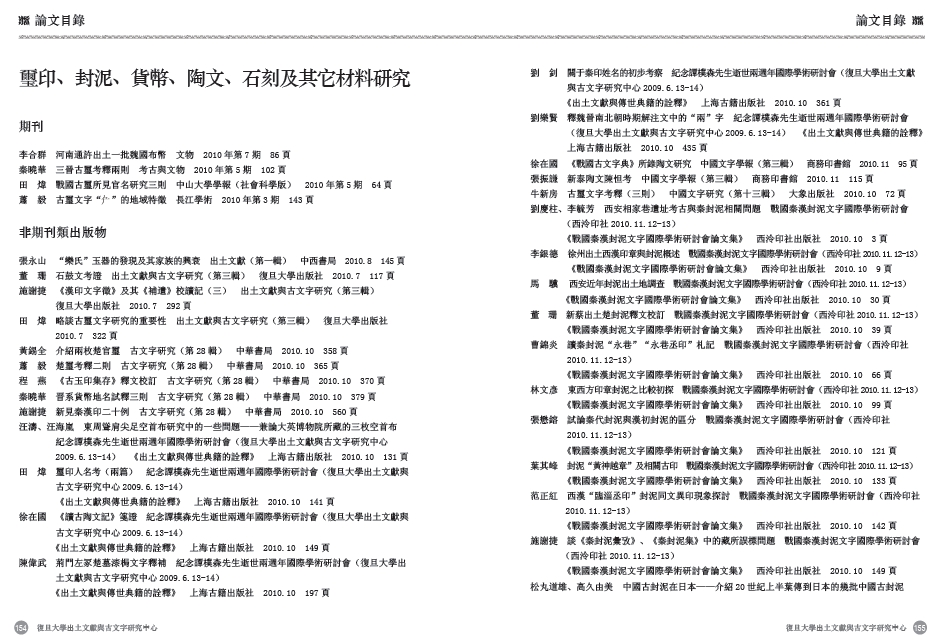 4.論文目錄:收錄當年出土文獻與古文字研究領域內的期刊論文、會議論文、非期刊類出版物論文以及網絡發布的重要論文。本欄目分為古文字綜合研究與考釋,甲骨文研究,金文研究,簡帛研 |