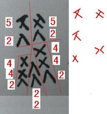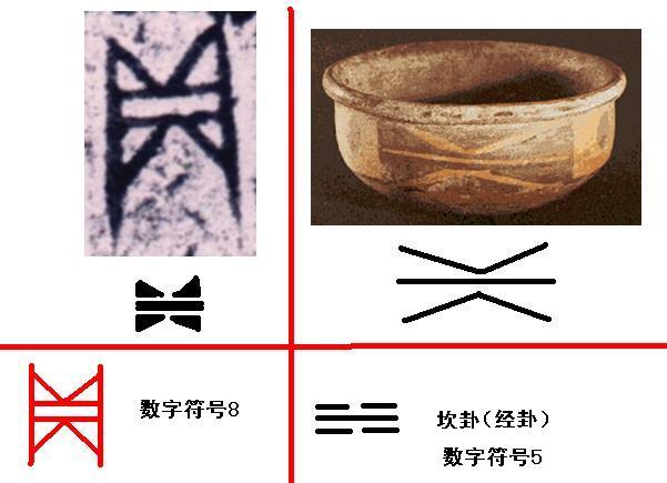 我认为那不是“一五六五五六” ,数字符号在甲骨文之前,必定要经历很长的发展时期,而在没有证据表明陶器期间到甲骨文这个时间段里数字符号是一致成型的,我们怎么能用甲骨文的数字符号来释读陶器期间的数字符号哪?我曾对半坡数字符号做过推导,认为当时的数字符号还不可能全部与甲骨文的数字相同,还有就是所谓“废弃的卦爻”,我认为那恰恰是