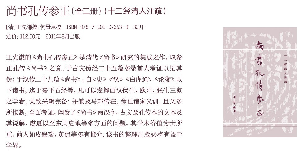 王先谦的《尚书孔传参正》是清代《尚书》研究的集成之作。先谦此书取参正孔传《尚书》之意,于古文伪经二十五篇多录前人考证以见其伪;于汉传二十九篇《尚书》,自《史》《汉》《白虎通》《论衡》以下诸书,迄于熹平石经等,凡可以发挥西汉伏生、欧阳、张生三家之学者,大致采辑完备;并兼及马郑传注,旁征诸家义训,且又多所按断,全面考证、阐发了《尚书》两汉今、古文及孔传本的文本及其说解、虞夏以至东周史地等多方面的问题。其学术价值为世所重,前人如皮锡瑞、黄侃等多有推介。