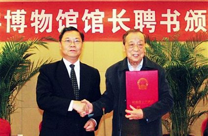 图为河南省文物局副局长李玉东向李学勤先生(右)颁发馆长聘书。图片来源:安阳新闻网