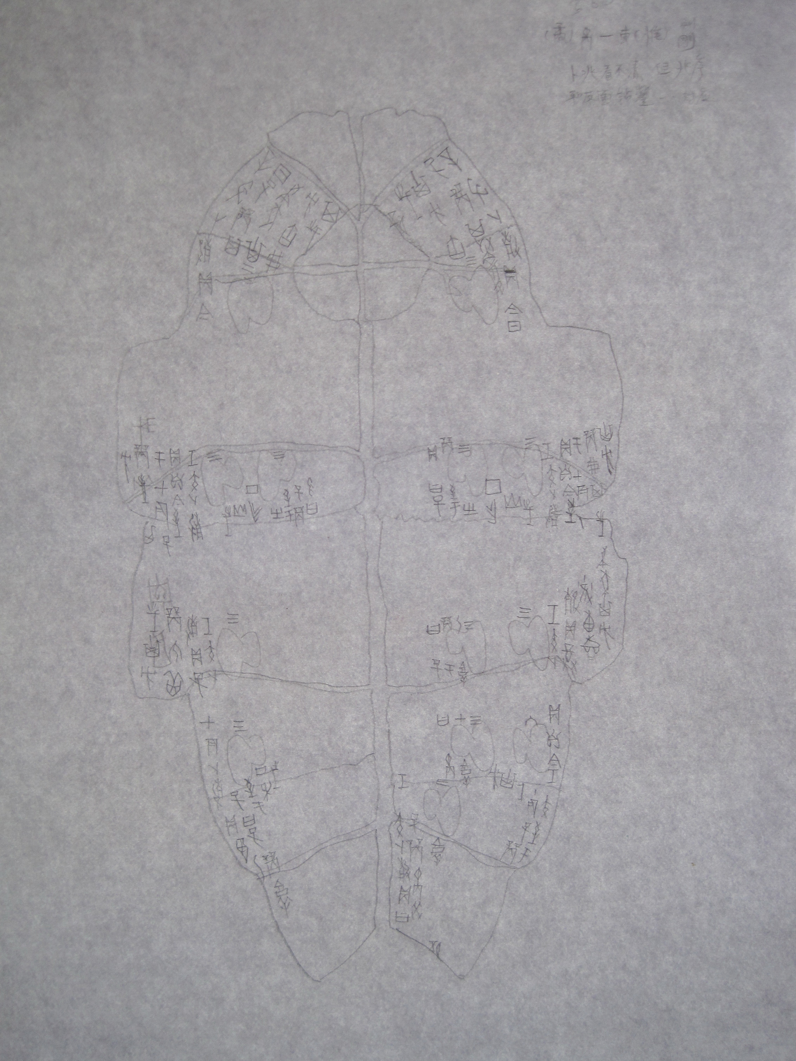 另外,這版的鑽鑿少且左右不對稱,兆序皆為三,而又有一個“六”。拓本不清楚,似乎看不到卜兆,不過把拓本正反面分別摹在一張白紙的正反面,對著光線,可以清楚看到兆序都在鑽鑿上方。同時發現,拓本反面似乎比正面小一圈。