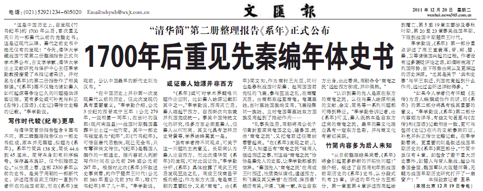 12月20日《文汇报》“国内新闻版”头条以 《1700年后重见先秦编年体史书》 对《清华大学藏战国竹简(贰)》进行了报道。(记者:王乐)