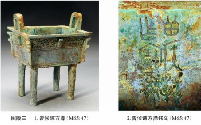 湖北隋州叶家山M65出土有铭青铜器多达11件,“为进一步推定墓主身份提供了重要依据。其中,一件方鼎、一件圆鼎和一件簋上均有“曾侯谏乍宝彝”,一件盉上为“侯用彝”,一件壶上为“曾侯作田壶”,作器者皆自铭为“曾侯谏”,或“曾侯”。综合出土文物及铭文判定,M65主人应当属曾侯谏墓。”(《湖北隋州叶家山M65发掘简报》)