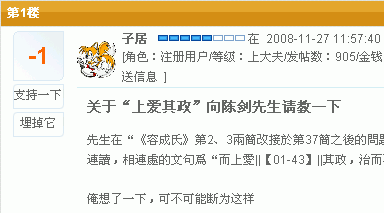 陈剑先生就是厉害,俺没说出来的,先生都知道了啊。 俺的感觉“酋清而上愛”与下面的“厚愛而薄斂”是对应的,“其政治而不賞,官而不爵”与“高山陞,蓁林||【31-44】||入焉以行政。於是乎治爵而行祿”是对应的。 确实如先生所说,“酋清而上愛”虽然勉强讲得通,但确实牵强些,俺不喜欢牵强,所以才问这个“爱”字的,或许可以参照“厚愛而薄斂”重新理解一下“酋清而上愛”? 呵,也许俺啥时再灵机一动一次,就知道正确答案了。 至于 “[厶/司](始)方爲三俈” 看着很别扭哦,先秦时有“始方某某”这样的说法么,好象要么会写作“始爲三俈”要么会写作“方爲三俈”吧? 或者是另行理解? 另外 哪位会员给的负分啊,什么理由给的负分呢,既然想埋掉这帖子,烦请把大名留一下可好?