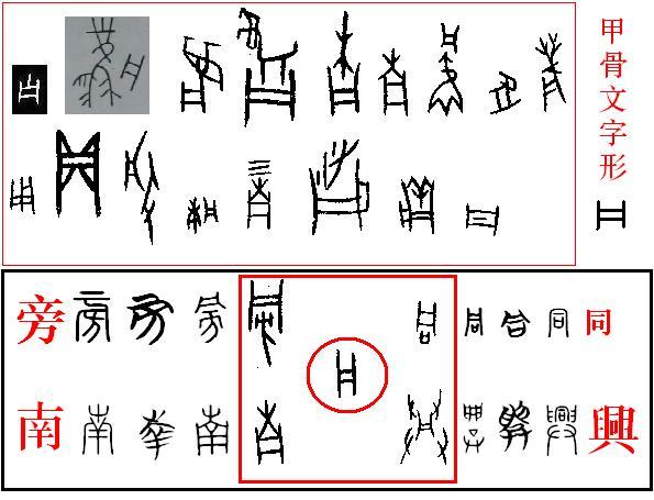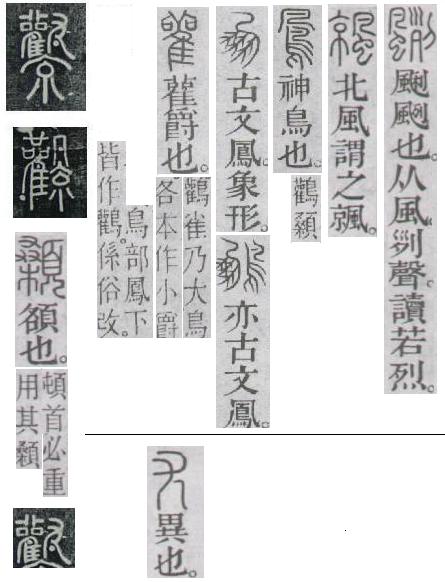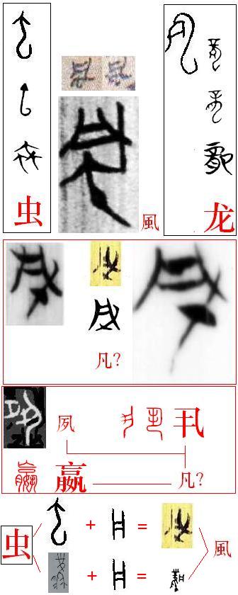 [现在被释读为“鳳”的字形中符不可能是所谓的声符,应该是表示某一区域的中心,而恰恰是凤本身是符,这个甲骨文“鳳”字形应该就是“风”字。而不带“”符的才是“凤”字本身,音符为“朋”。