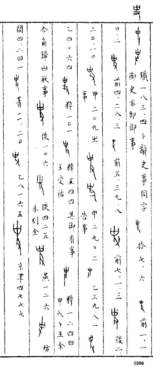 许慎以为“史”字从中(《说文解字·丨部》),但古文字的“中”与此不同,一竖所穿,不是两画上出的口字。王国维推测,“史”字所从的中乃“盛筴之器”(《释史》,收入《王国维遗书》,上海:上海古籍书店,1983年,第一册,《观堂集林》卷六,1-6页) 。
