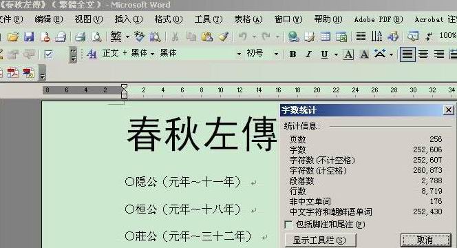 周楷煜:這人是來幹嘛的?踢掉踢掉。你信岳麓書社的統計,你怎麼不從網上下個白文本word版統計一下。 這樣操作: 打開word,打開你下載的文件(記住下載路徑和文件名),用“工具”菜單裏的“字數統計”命令進行統計。